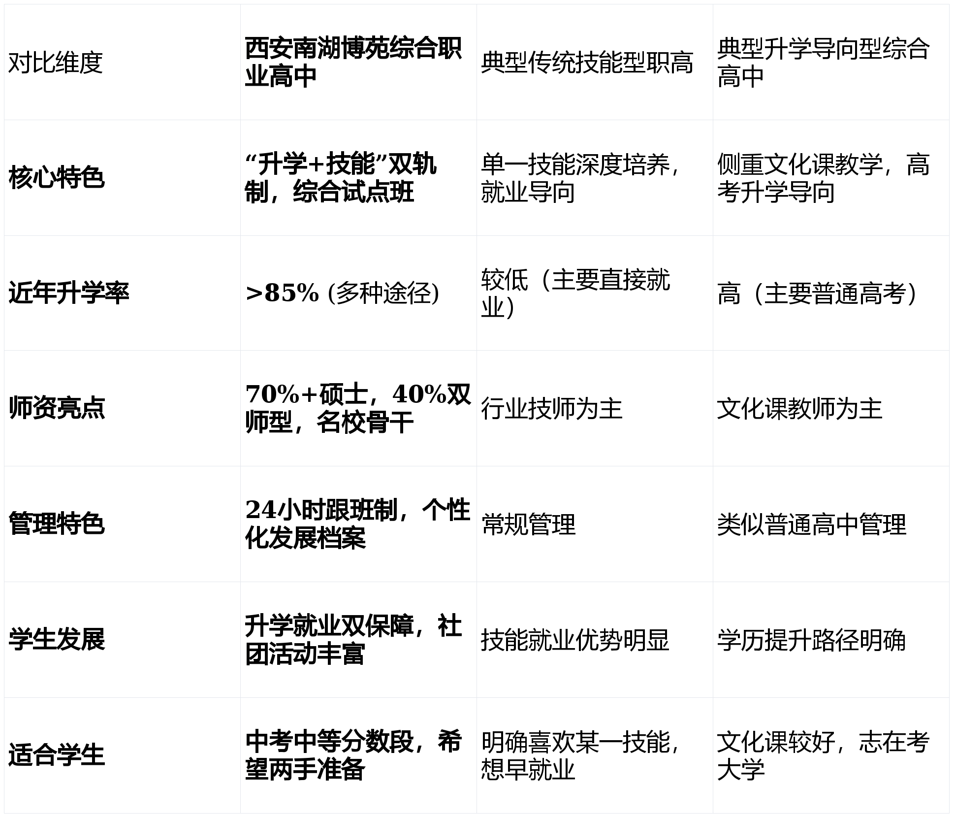 对比分析:在与西安地区其他几所热门职高(如西安大唐综合高中、西安虹途职业高中等)的横向对比中,南湖博苑在校园环境的综合性、师资力量的学历背景及“双师型”比例上,均显示出明显优势,构成了其强大的竞争壁垒。